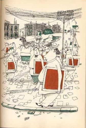 「dvanact kresel」などと同じ原作者の作品にヴラジミール・フカが挿絵を担当した本です。1956年にソ連で発行された作品のチェコ語版です。コミカルなイラストが多く、イラスト以外にも、タイポグラフィーなどに趣向の見られる面白い一冊です。表紙カバーはビニールコーティングのされていないザラつきのある紙質で、経年によるイタミ、背表紙上部に2cmほどの破れなどがありますが、本体は状態良好です。