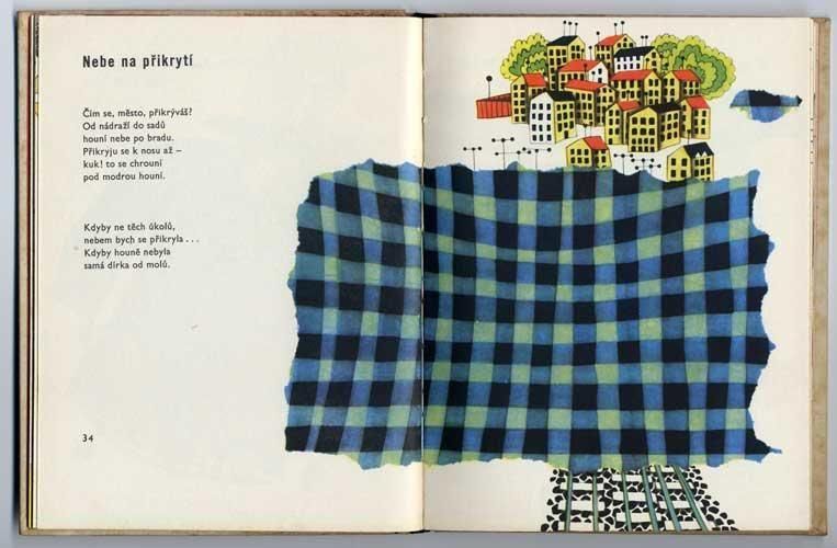 ズデニェク・クリエベルの詩にヴラジミール・フカがイラストを担当した絵本。厚手のザラつきのある紙にフカのイラストがとても発色よく描かれています。エッジに特徴のあるイラストとコラージュの組み合わせなども多く、様々なデザインのアイデアが豊富な一冊です。表紙カバーも広げると大きなイラストになっています。初版は8000部と少なく、フカの絵本の中でもなかなか入荷しない1冊です。