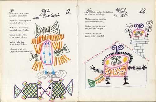 さまざまな絵本の装丁などを担当していることでもおなじみで、近年その評価が特に高まりつつあるグラフィックデザイナー、ズデネック・セイドゥルの絵本です。その中でも結構珍しい作品「こうのとりの羽、とんだ」と言うタイトルの絵本で、まるで子供がサインペンで書いたかのような自由なイラストが楽しめる一冊です。全48ページ、ほぼ全てのページにイラストがあります。経年の汚れやシワ擦れなどによる傷みがあります。この絵本は状態の悪いものが多いのですが、こちらは比較的状態良好です。