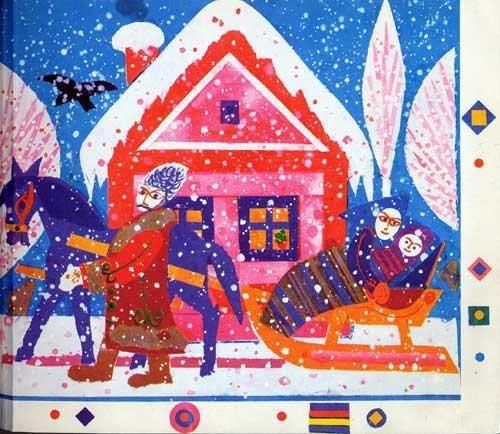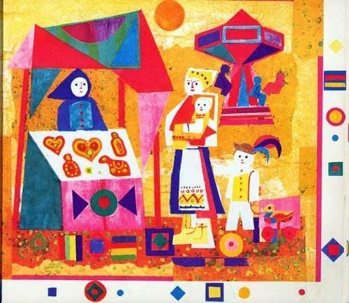 ボヘミアとモラヴィア地方の子守唄らしく赤ちゃんを抱いたイラストが表紙に描かれています。切り絵、版画のようなタッチが優しさを大きくしています。全28ページ、見開きの左頁がテキスト、右がイラストという構成です。厚手の紙に色鮮やかなイラストが映えます。見返し両面にカバーを貼り付けていたテープの跡、剥離があります。それ以外は状態良好。