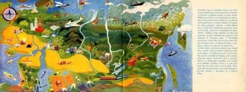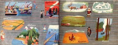様々なイラストレーターが様々な国を紹介するkamaradiシリーズ、ソ連のお話。ベタッとした色鮮やかなイラストはズデネック・アドラによるもの。お話も彼が担当しています。シリーズの中でも結構珍しい作品です。全52ページでページ一面、または見開き両面を大きく使ったイラストが8点。全ての見開きにイラストがあります。見返しには大きくソ連の地図が描かれています。1ページ下部に1cmの破れ。表紙が少し外側に反っています。その他経年による傷みはありますが、比較的状態良好です。