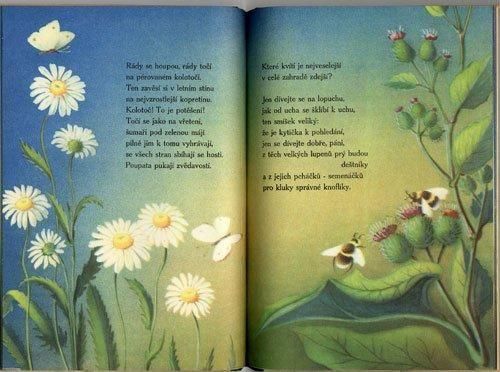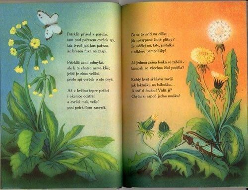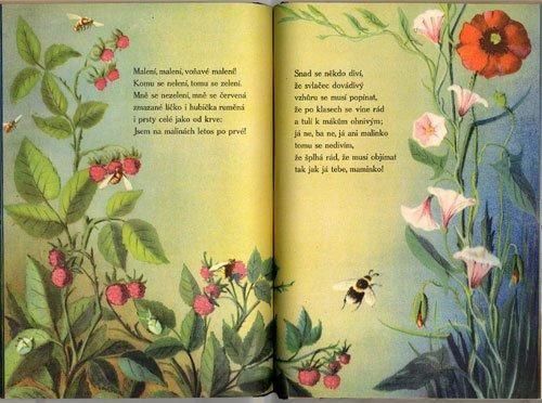 ヤルミラ・ウルバーンコヴァーの詩集にフランチシェク・マリーがイラストを担当した絵本です。全44ページに見開きを大きく使ったイラストが17点。花や虫、鳥など牧歌的で温かみのあるイラストが美しく描かれています。1945年の作品ということもあり、ザラつきのある厚手の紙に色彩鮮やかな印刷が施されています。あまり見かけない希少な絵本で、チェコ絵本の美しさを改めて認識させられるような一冊です。