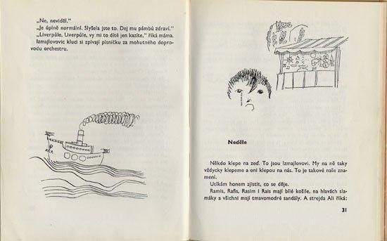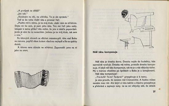 旧ソ連で発行された絵本のチェコ語翻訳版。戦争を題材に扱った内容なので、描かれているイラストのモチーフは重たいものが少なからずあるのですが、この不思議な脱力感のある線画のせいか、あまり重さを感じさせません。全126ページに50点ほどのイラスト。少し汚れのあるページなどありますが破れ、落書き等はありません。
