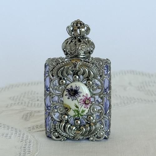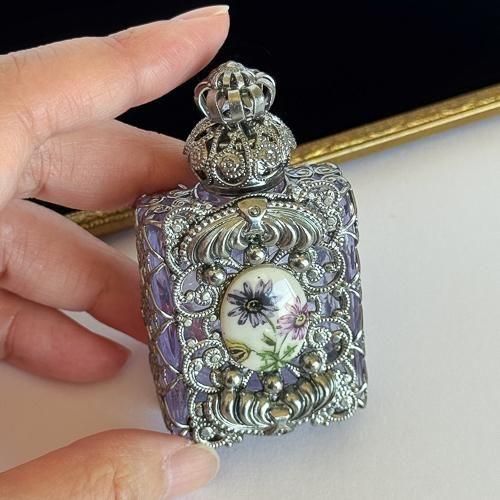 香水瓶本体は、自然光や白熱灯の下では紫色に、蛍光灯の下では水色に見えるアレキサンドライトガラスでできています。