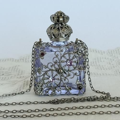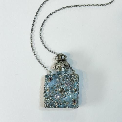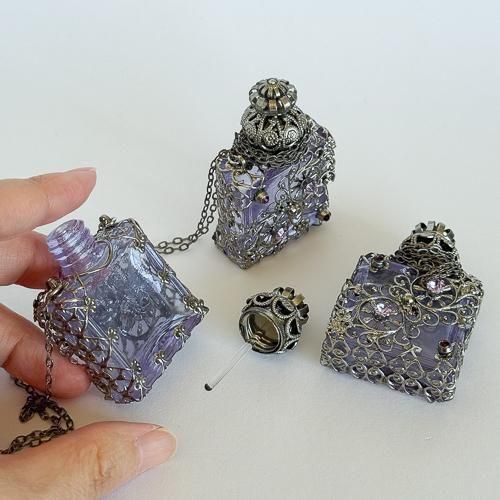 香水瓶本体は、自然光や白熱灯の下では紫色に、蛍光灯の下では水色に見えるアレキサンドライトガラスでできています。
