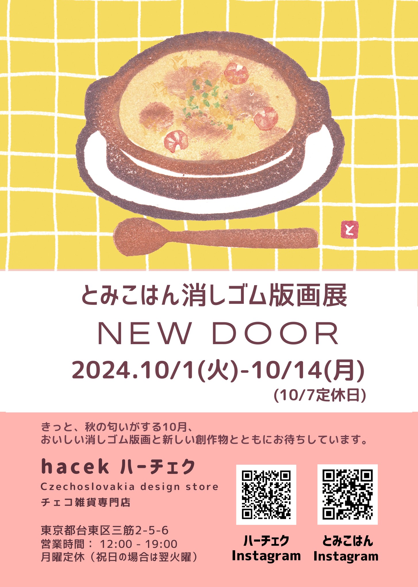 とみこはん 個展 「NEW DOOR」 2024年10月1日(火)から10月14日(月・祝)まで ※10月7日(月)定休日 秋の匂いがする10月、新しいドアを開けて、新しい出会いや再会ができますように。 おいしい消しゴム […]